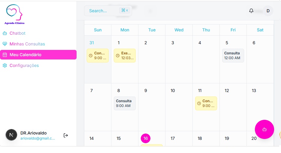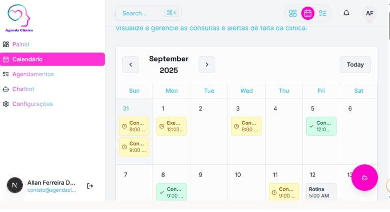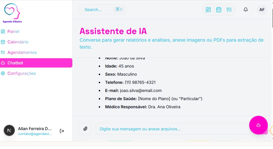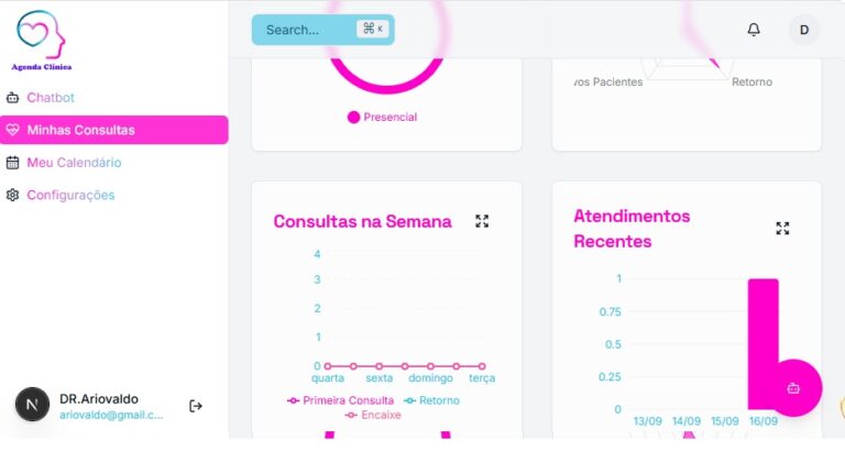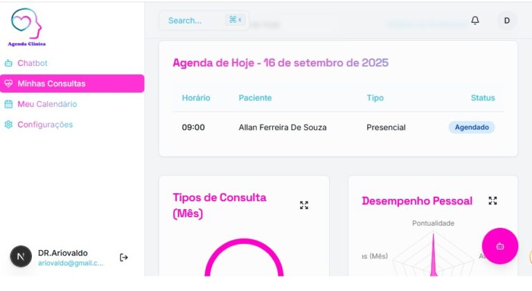 Visão consolidada de consultas, indicadores de produtividade e histórico rápido, tudo em uma única tela.